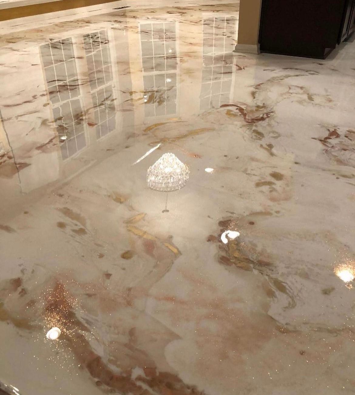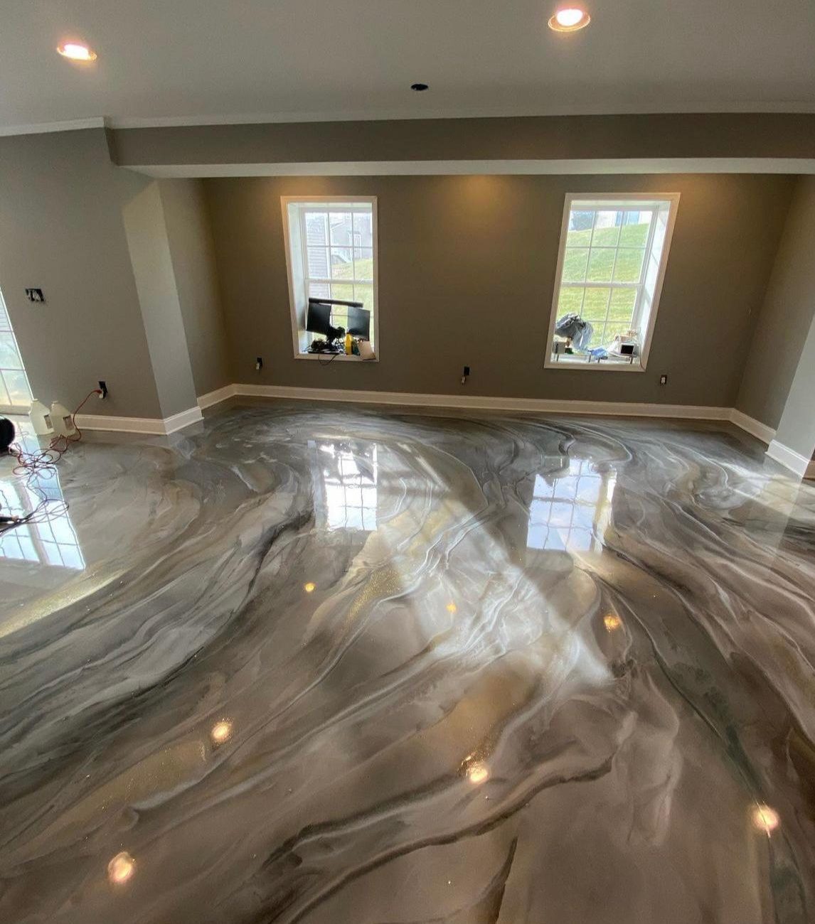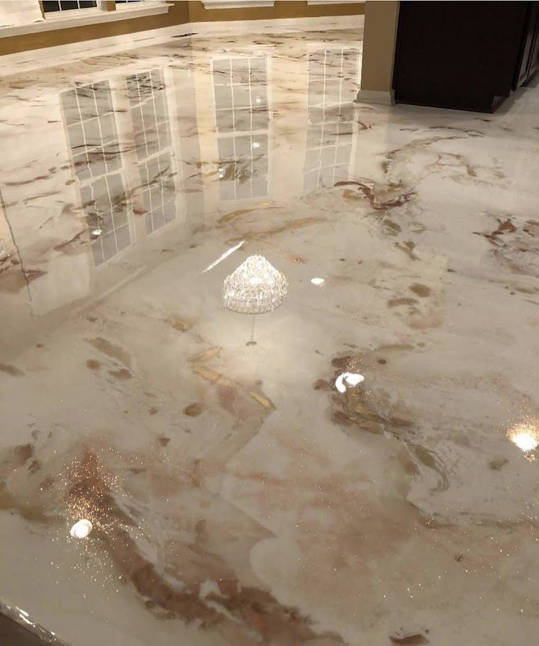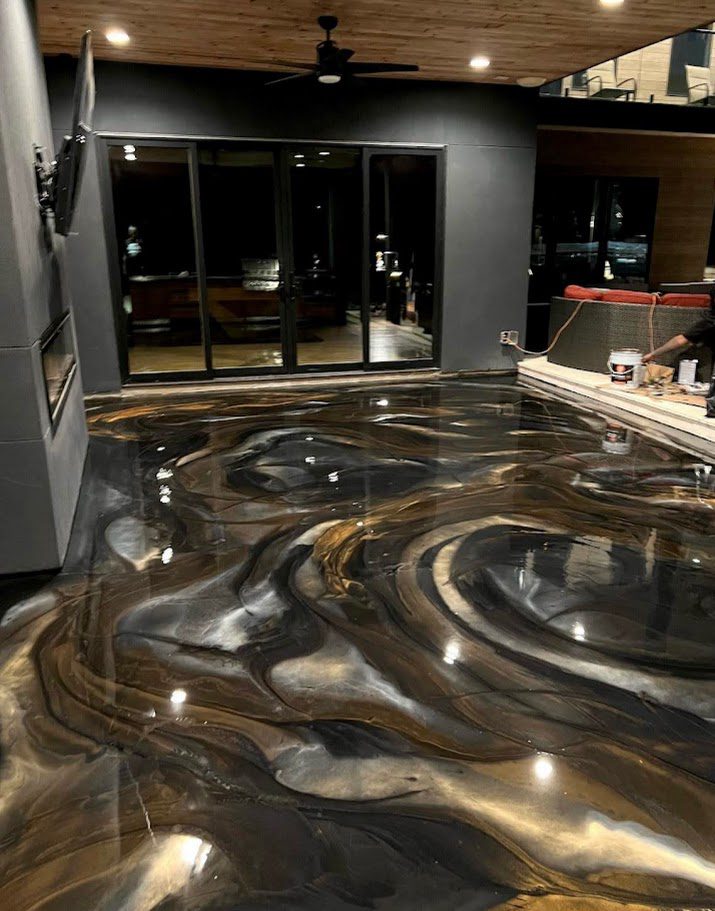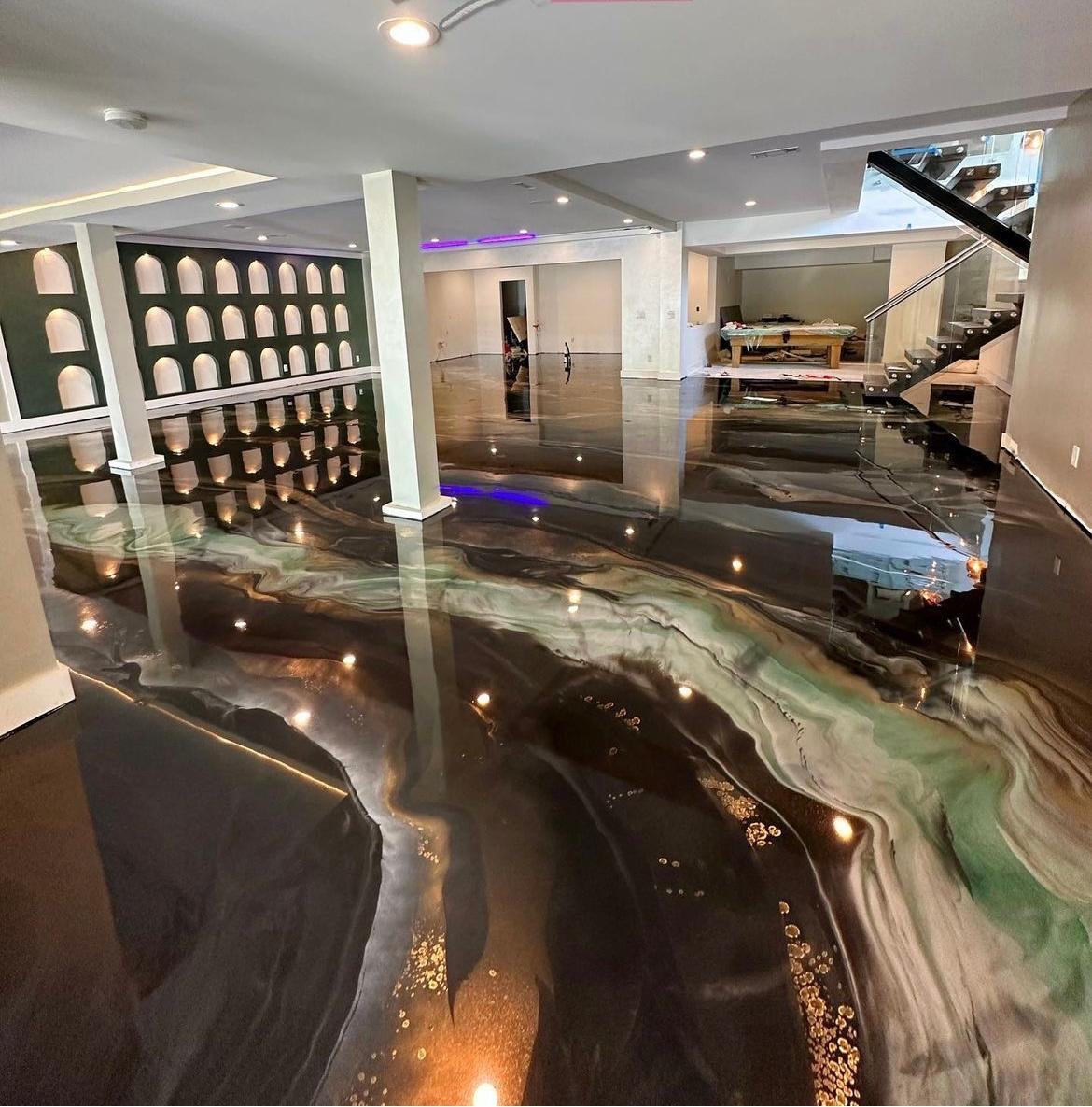 Metallisches Epoxidharz ist eine spezielle Art von Epoxidbeschichtung, die mit metallischen Pigmenten vermischt wird. Diese Pigmente erzeugen beim Auftragen auf den Boden schimmernde, dreidimensionale Effekte, die an fließendes Wasser, geschmolzenes Metall oder Marmor erinnern. Jeder metallische Epoxidharzboden ist ein Unikat, da die Muster und Effekte durch die Art und Weise, wie das Harz aufgetragen wird, beeinflusst werden.